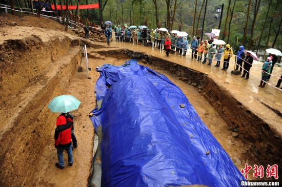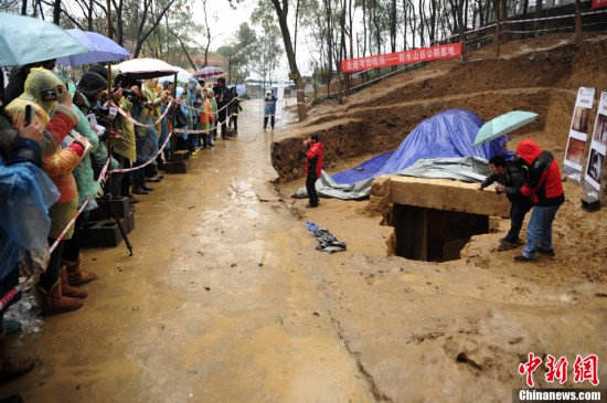 12月30日,重慶市彭水縣在山谷公園建設施工過程中發掘出一座地下石墓。這座墓穴結構分為墓道、墓門、甬道、墓室以及棺床等附屬設施。通長有15.8米、最寬處2.8米、墓室內高3.1米。由于墓室已經遭遇過多次盜墓,墓室內的棺槨和陪葬器具都所剩無幾,不過,根據墓室的規格和建造方式,考古工作人員初步推斷,墓室的主人應該是蜀漢末年彭水縣擔任地方長官的行政官吏。是目前發現的渝東南地區最大的漢代石室墓。圖為考古工作人員正在給市民介紹石室墓。(陳超 攝)