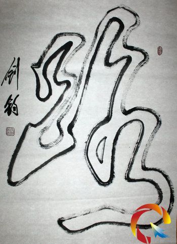 “龍”字獲獎的啟示,使安劍鈞的“雙鉤”書法達到的一個新的高度。他在掌握書寫各種字體的基礎上,通過對這形、字意的理解、想象,運用較熟練的雙鉤形式,寫出自己獨創的“創意雙鉤字”。如他寫“黃河”,從左上角起筆勾到右上角,曲曲彎彎順勢而下,一下勾出左半部,然后陡然扶搖直上,一下子勾到起筆處,使“九曲黃河”有了波濤滾滾,一瀉千里的氣勢。他寫“路”字,峰回路轉,一揮而就,不僅使你欣賞到書法藝術之美,更使你體味到人生之路的坎坷曲折,漫長遙遠。他寫“舞”字,一個恰似婀娜多姿的少女單腿獨立,昂首向上,似乎在向往美好的生活的形象躍然紙上。他寫“虎”字,虎臥山崗,仰天長嘯,虎虎生威。他寫“鳳”字,鳳駕祥云,超凡脫俗,非梧不棲。他寫“紅日照山河”,先用紅印泥寫成“日”字,用墨寫成象形加篆書的雙鉤“山、河”,三個字構成一幅圖畫:紅日高照,青山巍巍,綠水長流,寓意偉大祖國前程似錦。