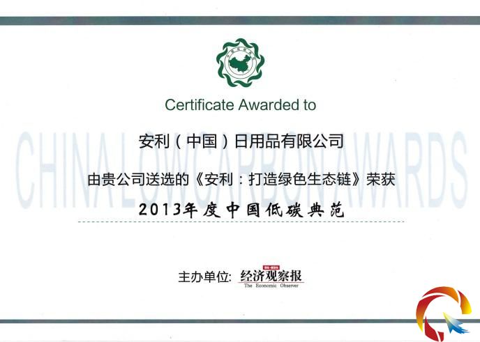 由《經(jīng)濟觀察報》主辦的"2013年度中國低碳典范評選頒獎盛典暨高峰論壇"在京舉行,安利公司憑借在研發(fā)、生產(chǎn)、IT、物流等全供應(yīng)鏈的"綠色管理"及在環(huán)保公益教育項目的持續(xù)性投入,榮獲"2013年度中國低碳典范"獎項,是直銷行業(yè)唯一獲獎的企業(yè)。