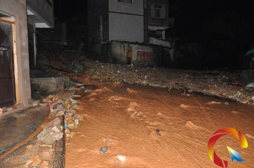 記者在現場看到,屯上村村頭公路和橋頭老車站停車場堆積了大量的泥沙和石塊,堆積最多的地方厚度達五十公分左右,停放在停車場內的小型車輛,輪子有一半被埋在泥沙里,少量的紅色泥水還在流進農戶家中,該鎮政府值班領導干部與村干正在現場指揮群眾引水排洪和開展防護工作。