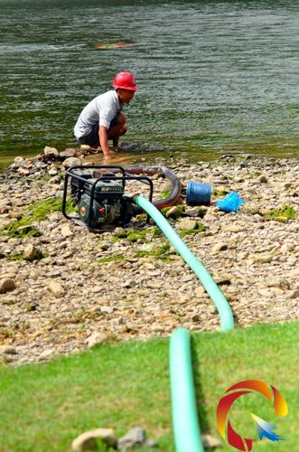 7月20日上午,記者在清水江普舍寨河段看到,當地幾戶群眾在河岸擺起了兩臺抽水機,并接上輸水管道,然后將清水江中的水抽放到位于高處的農田中。抽水機“轟轟”的響動聲不絕于耳。