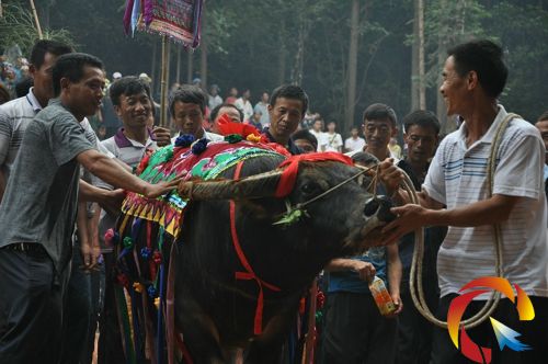 當天,是當地各村寨牽水牛進塘的第一天,牛現塘之后,客人便來祝賀,然后,主人邀約客人,返家喝酒唱歌。據了解,當地苗、侗族同胞六年一次的牯藏節將于2014年10月舉行。(楊代富 羅茜)