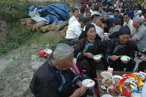 “請客”資金主要是通過募捐等方式產生,募捐者有社會熱心人士、各村寨外出參加工作人員以及外出打工人員等,全縣25個鄉鎮,總計籌措到的資金達到了1300多萬元。黎平縣洪州鎮包寨侗村100多外出打工人員集體返家,每人不僅捐出了500元的現金,而且還親自為老人們張羅飯菜。圖為黎平縣洪州鎮包寨侗村的老人正在用餐的情形。(陸書明 尹少強 攝影報道)