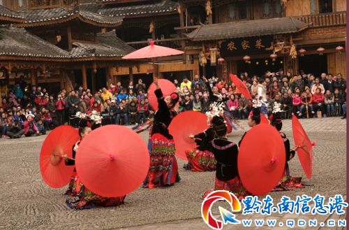 西江苗寨姑娘表演的紅傘舞