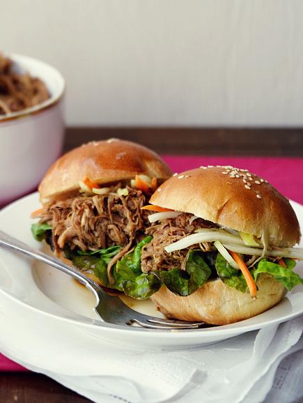 5.將肉絲直接填到漢堡坯子里,搭配喜歡的蔬菜和腌菜即可。