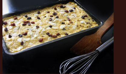 4、倒入17X28cm的烤盤中,這個適合將表面盡量抹平。撒上剩余的葡萄干和松子仁(杏仁片)。