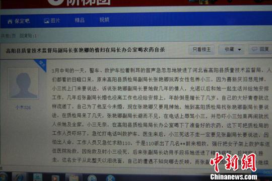 網帖報料稱:“3月中旬的一天,警車、救護車拉著刺耳的笛聲急,怱怱地駛進了河北省高陽縣質量技術監督局,人們都看的目瞪口呆,原來高陽縣質檢局副局長張艷卿玩弄女性包養小三,因為喜新厭舊想甩掉,小三找上門來要說法,訴說張艷卿副局長要她做幾年的情人,允諾以后和她一起生活并給她安排工作。幾年后張副局長婚也沒離工作也沒給安排上,該女年齡卻增長了幾歲。自己的大好青春就這樣流逝了,自己為了他至今未婚,現在張艷卿又要甩掉她,她到高陽質檢局找張艷卿副局長要說法。在質檢局呆了幾天,張艷卿副局長避而不見。小三無奈,在高陽縣質檢局局長辦公室喝下了準備好的農藥……。”