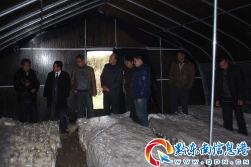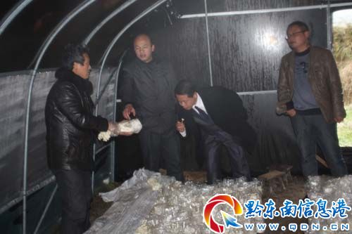 如今華寨村考慮到食用菌發展中存在的品種單一、發展資金不足等問題,制定了今后食用菌的發展方向和工作重點:一是調整優化品種結構,增加高檔菇的栽培面積;二是繼續擴大種植規模,引導村民成立組織協會,積極鼓勵外村投資加盟,引進資金,確保菌農增收;三是修建冰凍庫;四是推廣食用菌無公害栽培技術。圖為隆里鄉黨委書記唐立坤等黨政班子成員冒嚴寒深入華寨村龍立堂食用菌鋼架大棚了解金針菇的價格情況。(石福濤 林澤龍 攝)