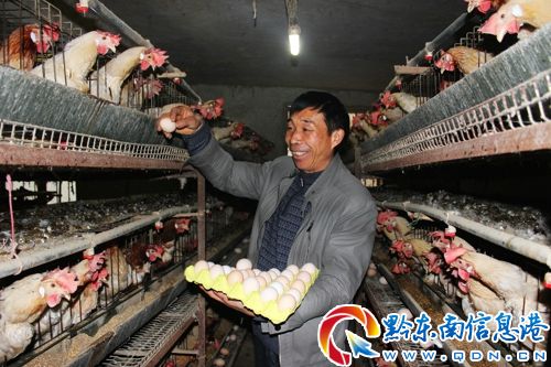 雷山縣西江鎮連城村余俊海支書為了起到黨員干部帶頭致富作用,2011年以來,他開起了蛋雞養殖場,飼養6000余只蛋雞。目前,養雞場每天出蛋4000余個,日收入近3000元,2012年創收了近100多萬元。圖為2013年1月24日余俊海在他的養雞場樂呵呵揀雞蛋。(李雪 攝)