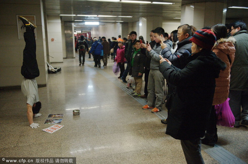 2月4日,北京某地鐵通道,前體操運動員張尚武賣藝賺錢。