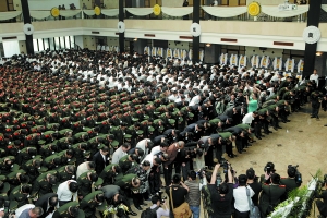 “立志報國壯行軍旅當忠誠衛士,舍生忘死大義為民傳雷鋒精神,沉痛悼念鄭益龍烈士。”巨幅挽聯之間,遺像上英氣勃發的鄭益龍微笑地注視著前來送別的人們。遺像下,鄭益龍烈士身穿筆挺的軍裝,身裹鮮紅的黨旗,靜靜躺在鮮花翠柏間的玻璃棺中。數百名鄭益龍身前所在部隊的戰友們,已經列好整齊的方陣,讓他們的好上尉最后看一眼他畢生熱愛的那一片橄欖綠。
