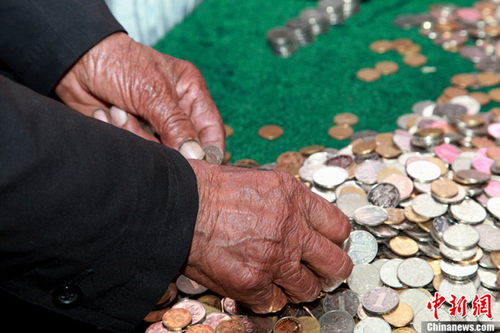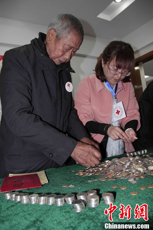 圖為紅會工作人員和老人一起清點零錢。 圖片來源:王俊榮 CFP視覺中國