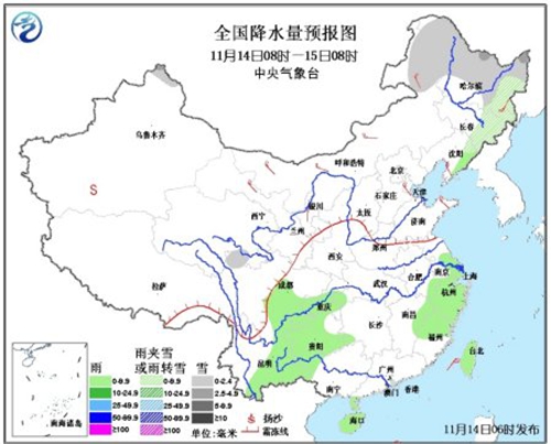 14日08時至15日08時,內(nèi)蒙古東北部、黑龍江大部、吉林東部、遼寧東部、青海東南部、新疆北部等地有小雪或雨夾雪,局地中雪;江南東部、西南地區(qū)東部、海南、臺灣等地有小雨或陣雨。內(nèi)蒙古、華北北部和東部、山東半島等地有4~5級風(fēng),南海南部有6~8級、陣風(fēng)9級的旋轉(zhuǎn)風(fēng)。
