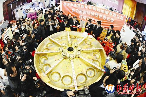 昨日,在太原舉辦的“晉人、晉菜、晉味道”全國(guó)第七屆烹飪技能服務(wù)競(jìng)賽上,一口巨大的銅鍋吸引了眾人的眼球。這口由臨汾市唐宮面來(lái)香餐飲連鎖有限公司制作展示的“剪刀面八合御鍋”,全部由黃銅板制成,八面扇形銅鍋組成一個(gè)直徑2.85米、深約0.26米的圓形銅鍋,并由16臺(tái)高功率電磁爐控制水溫,能同時(shí)做出八種味道的剪刀面。這口大鍋被世界紀(jì)錄協(xié)會(huì)的高級(jí)認(rèn)證官現(xiàn)場(chǎng)認(rèn)證為世界上最大的“剪刀面八合御鍋”。(劉江 攝影報(bào)道)