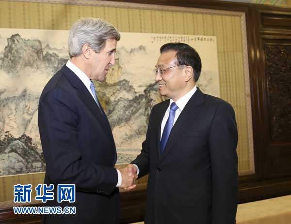 國(guó)務(wù)院總理李克強(qiáng)13日在中南海紫光閣會(huì)見(jiàn)美國(guó)國(guó)務(wù)卿克里,就深化中美合作及共同關(guān)心的國(guó)際和地區(qū)熱點(diǎn)問(wèn)題交換意見(jiàn)。
