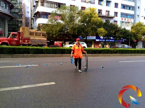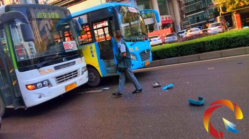 17時10分,記者趕到事發地時兩輛發生碰撞的公交車已開離,但在馬路中間仍能看到因碰撞而掉落的藍色車殼,因過往車輛較多,被碾壓的車殼時不時發出咯吱咯吱的聲響。