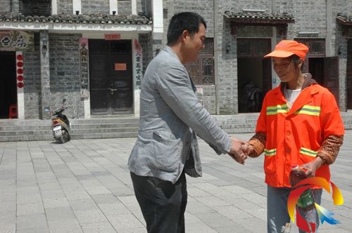 林本旺向黎平環(huán)衛(wèi)工人發(fā)放自己生產(chǎn)的食用油