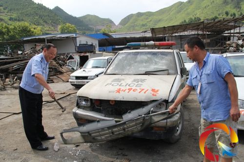 本網訊 8月14日,州交警支隊在一金屬回收公司當場砸毀9輛已達報廢年限警用車輛,以此來加強公安交警正規化建設,樹立交警良好的公眾形象。