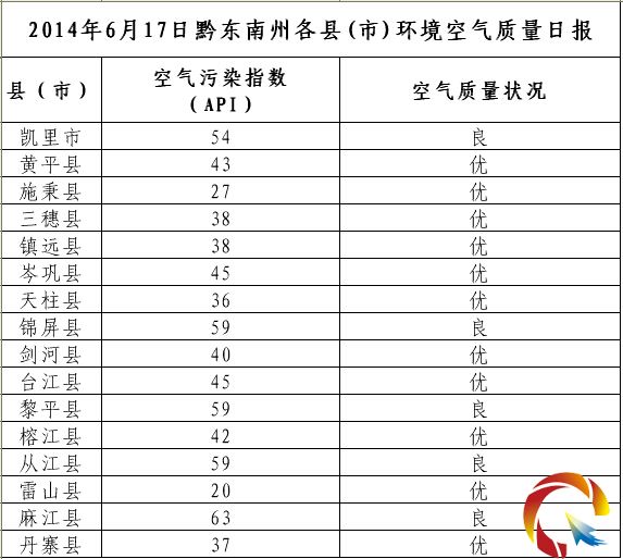 2014年6月17日黔東南州各縣(市)環境空氣質量日報