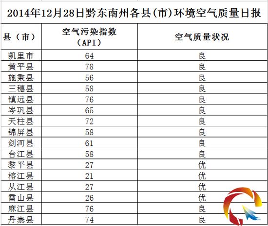 2014年12月28日黔東南州各縣(市)環(huán)境空氣質(zhì)量日?qǐng)?bào)