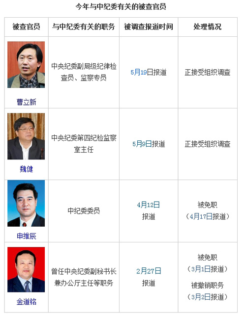 在魏健、曹立新之前,今年至少已有2名與中紀(jì)委有關(guān)的省部級(jí)官員被查。2月27日山西人大常委會(huì)副主任金道銘被查。簡(jiǎn)歷顯示,1993年至2002年期間,金道銘曾擔(dān)任中央紀(jì)委監(jiān)察綜合室副主任兼外事辦主任、中央紀(jì)委外事局局長(zhǎng)、中央紀(jì)委副秘書長(zhǎng)等職務(wù),后又于2006年8月至2010年9月任山西省紀(jì)委書記。
