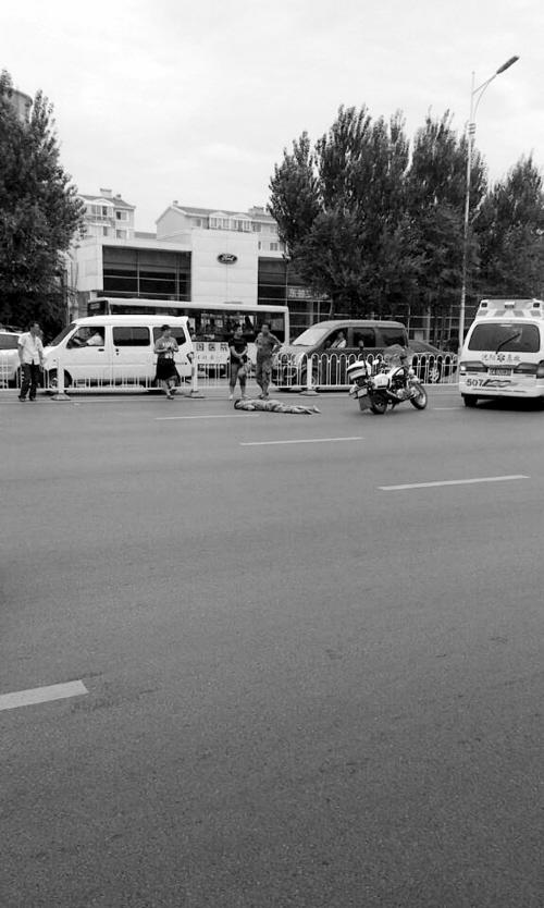 “那人應該是附近的居民,好像是剛逛完超市的樣子。”韓先生稱,“邁銳寶”在斑馬線上將男子撞飛后,又開出十幾米才停下來,前機蓋被撞癟。中年男子則被撞出40多米后,趴在了馬路上,頭下流出一大攤鮮血,鞋都被撞飛了。肇事車上下來兩個人,立刻來到傷者身邊,司機是個年輕的小伙子,他馬上撥打120急救電話并報警。在等待急救車的過程中,天上飄下一點小雨,小伙子撐開一把藍傘,給被撞男子擋雨。