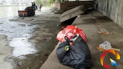 除了河面上漂著垃圾,部分河段的河岸也有很多垃圾,盤龍橋下,就是如此。橋下有一個廢舊皮沙發,滿是灰塵和污垢。附近市民說,它在此處已一年多時間,無人問津。“留在此處,確實是大煞風景”。