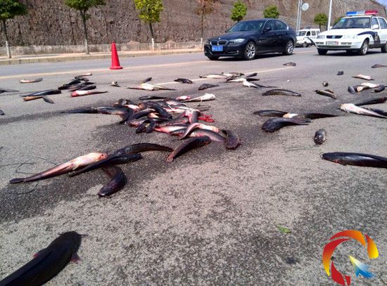 記者了解到,運魚車是從廣西南寧開往凱里的,運魚車司機崔師傅告訴記者,17日中午12點40分左右發現魚從車上漏出來的。