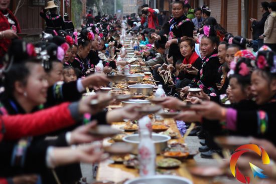 每逢過年過節(jié),雷山的苗族同胞都喜歡擺起長桌宴來慶賀。李雪 攝