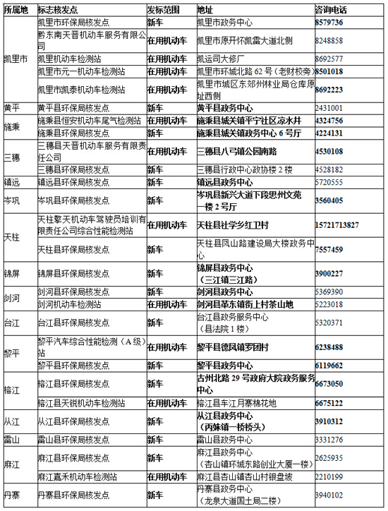 為便于我州廣大市民領取機動車環保檢驗合格標志,黔東州環保局在各市縣設立了共二十七個機動車環保檢驗合格標志發放點,請廣大市民按要求到下列站點領取,不分區域限制,名單信息如下:
