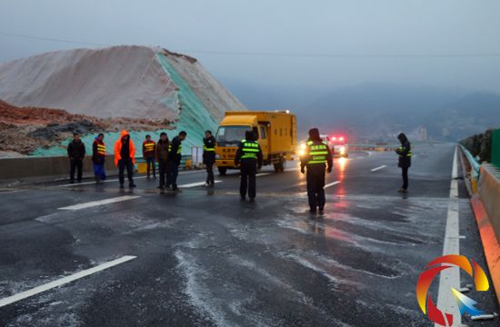 由于路面結(jié)冰嚴(yán)重,經(jīng)各部門商議,決定從31日0時起進(jìn)行臨時交通管制,直至上午12時15分,全線交通才恢復(fù)正常通行。解除交通管制時,高速路政、高速交警兵分兩路帶道壓速,以確保司乘人員的行車安全。(潘俊霖)