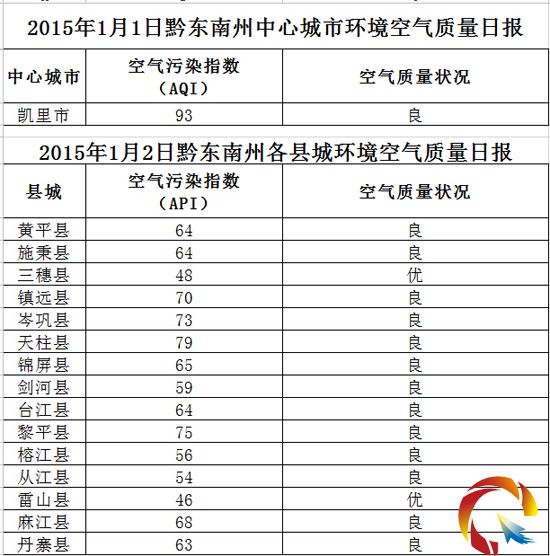 2015年1月2日黔東南州各縣(市)環境空氣質量日報