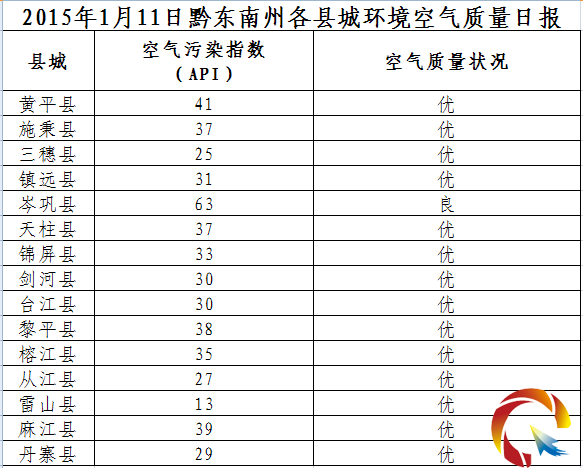 2015年1月11日黔東南州各縣(市)環(huán)境空氣質(zhì)量日報