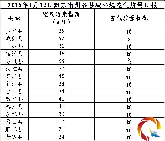 2015年1月12日黔東南州各縣(市)環境空氣質量日報