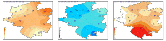 氣溫:2月上旬我州各地平均氣溫5.4~7.8℃ (圖1左),與歷年同期相比偏低0.7~1.7℃(圖1中);旬極端最低氣溫榕江、從江分別為1.9℃、0.6℃,其余大部地區為-2.5~-0.7℃(圖1右),出現在6日。
