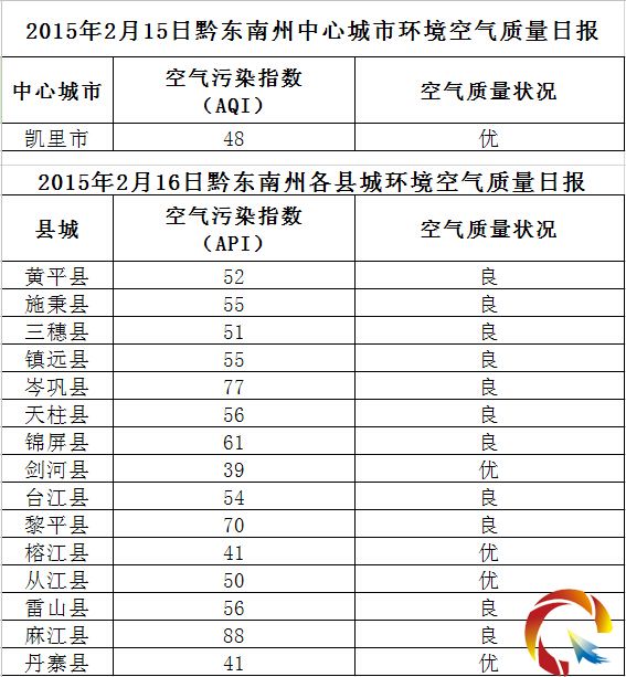 2015年2月16日黔東南州各縣(市)環境空氣質量日報