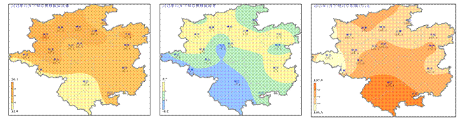 日照、積溫:3月下旬日照時數12.8~26.1h (圖3左),與歷年同期相比凱里、黃平、施秉、鎮遠、三穗、劍河、黎平、天柱偏多0.4~5.7h,其余大部地區偏少0.9~7.4h (圖3中);≥10℃的活動積溫為133.3~197.9℃·d (圖3右)。