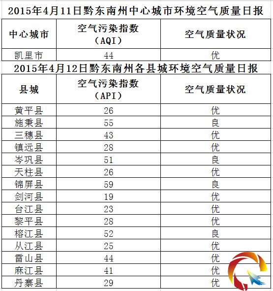 2015年4月12日黔東南州各縣(市)環(huán)境空氣質(zhì)量日?qǐng)?bào)