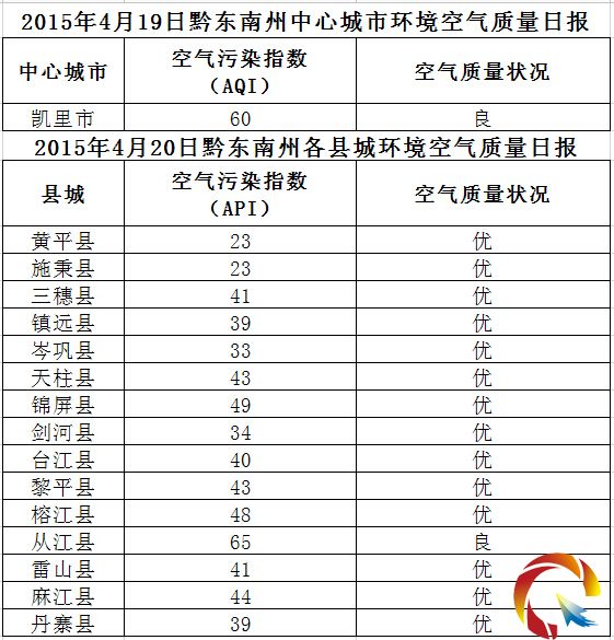 2015年4月20日黔東南州各縣(市)環境空氣質量日報