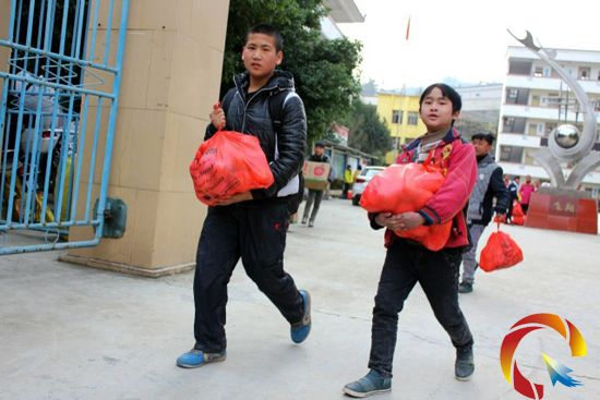 本網訊 1月16日下午,榕江縣樂里中學的不少學生提著一箱蘋果和行李高高興興地走出校門,后各自回家。據悉,這蘋果是學校讓他們帶回家孝敬老人的。