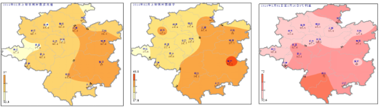 日照、積溫:2月上旬各地日照時數32.3h(麻江)~57h(黎平)(圖3左),與歷年同期相比偏多17.8~41.1h(圖3中);旬內各地獲得≥5℃的活動積溫32.6℃·d(三穗)~72℃·d(榕江)(圖3右)。4~10日全州維持晴好天氣,氣溫持續回升,促進冬種作物緩慢生長。