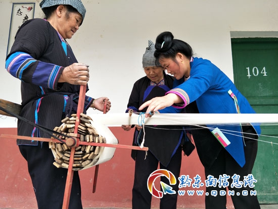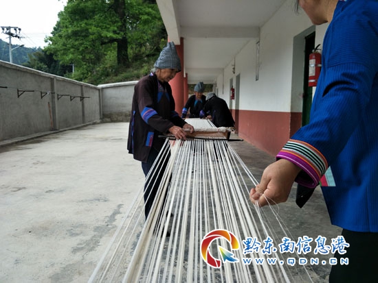 本網訊 5月23日,筆者在從江縣慶云鎮佰你村看到當地侗族婦女忙著經線刷線,為織侗布做準備的手工技藝制作畫面。