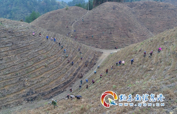 11月21日,在貴州省黔東南苗族侗族自治州丹寨縣排調鎮送償村新建的400余畝茶葉基地,近100名苗族村民在搶種茶苗,茶葉種植成為了該村又一助農增收產業。(楊武魁 攝)