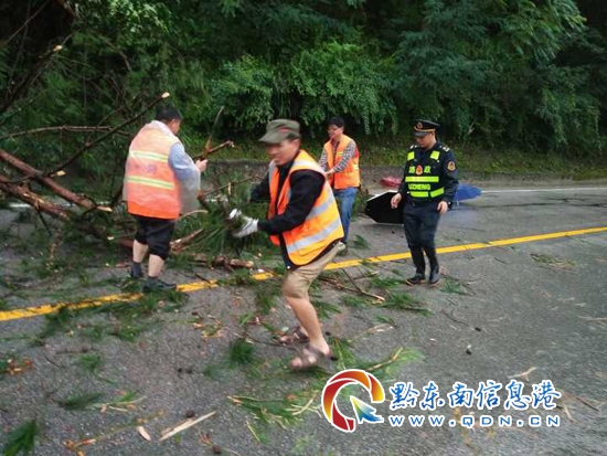 本網訊 6月29日,凱里地區普降暴雨。凱里公路管理段工作人員在巡路中發現S308線K246+400處行道樹倒塌阻斷交通。發現這一情況后,凱里公路管理段立即組織人員進行清理,并在2小時后恢復交通。