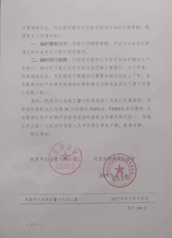由于永樂路部分行道樹樹枝將與供電線路發生接觸,遇刮風下雨樹枝將可能帶電,對過往行人形成嚴重的安全隱患。為排除隱患,根據凱里市供電局城區分局的工作安排,結我市道路交通管理實際情況,定于2017年8月15日9時至17時對永樂路開展修枝作業,作業期間需對永樂路分段進行臨時交通管制。現將有關工作通知如下: