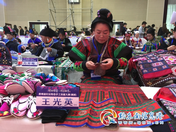 為深化“錦繡計劃”巾幗脫貧行動,積極引領婦女通過指尖技藝實現巧手脫貧,在黨的十九大剛剛閉幕之際,2017年11月9日省婦聯在貴陽舉辦了“對話錦繡﹒巧手脫貧”--婦女特色手工技能大賽,凱里市高度重視,積極推選來自旁海鎮的李紹芬、王金花、灣水鎮的王樹英、舟溪鎮的王光英以及凱里市民族民間蠟染雕繡廠的羅芳共5位繡娘代表參加大賽。在比賽中,凱里市5名繡娘充分展現了我市獨有的苗族傳統手工刺繡技藝,在競賽中脫穎而出,取得了優異的成績,在全省2個特等獎中我市選手王金花就喜獲1個,一等獎1個、三等獎2個。
