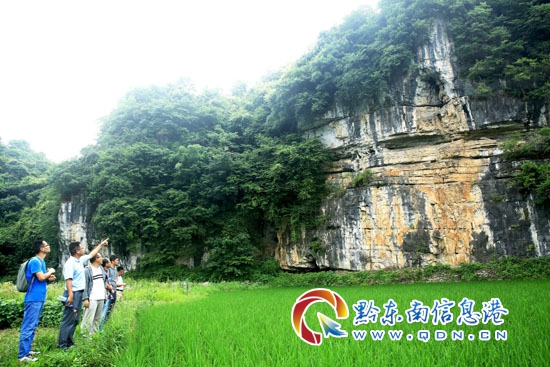 圖為羅光杰博士(二)一行到五角星石崖實(shí)地考察的情形。陸書明 攝