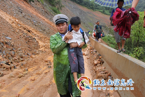 因車輛受阻,民警投入清障奮戰中,在現場勸返了部分想步行通過的群眾,但還是時有群眾從塌方路段步行通過,民警則在確保安全情況下,幫群眾抱小孩、扛物品,及時護航他們安全通過。