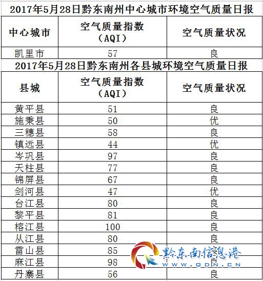 2017年5月29日黔東南州各縣(市)環(huán)境空氣質(zhì)量日報