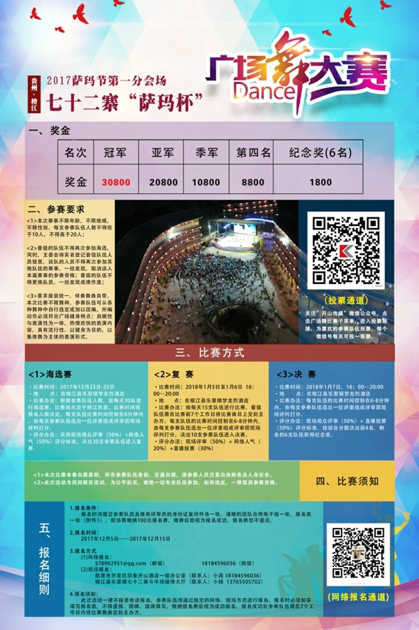 根據參賽隊伍人數,按每天20隊進行海選賽,比賽地點定于榕江縣樂里鎮夢龍烈酒店,比賽時間為2017年12月23日—12月25日,,每支隊伍比賽時間控制在6分鐘內,由每支參賽隊伍選出一位評委組成評審團現場評判打分,采用現場觀眾評審(50%)+ 網絡投票(50%)評分標準,決出30支參賽隊伍進入復賽。